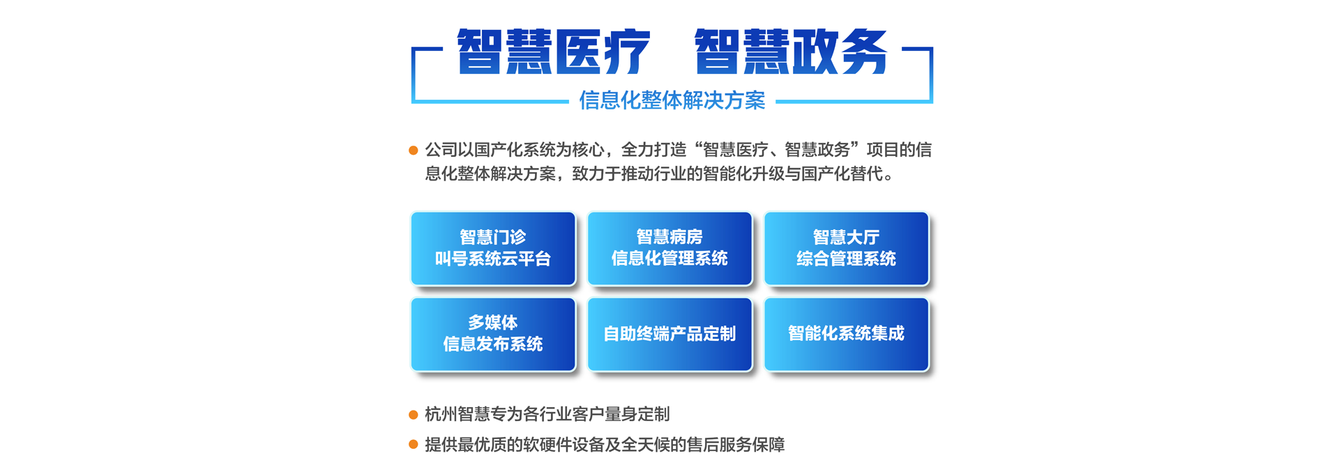 杭州智慧科技有限公司初創(chuàng)于2003年,總部位于重要的電子商務(wù)中心中國(guó)杭州公司主營(yíng)業(yè)務(wù)有:智慧分診叫號(hào)系統(tǒng)、智慧病房醫(yī)護(hù)對(duì)講系統(tǒng)、智慧大廳綜合管理系統(tǒng)、智慧政務(wù)管理系統(tǒng)、智慧多媒體信息發(fā)布系統(tǒng)、導(dǎo)診系統(tǒng)及各自助終端產(chǎn)品定制。專(zhuān)為各行業(yè)客戶量身定制。公司已有20余年行業(yè)經(jīng)驗(yàn)沉淀積累,擁有優(yōu)秀的產(chǎn)品外觀設(shè)計(jì)師和各類(lèi)中高級(jí)專(zhuān)業(yè)技術(shù)工程師,確保所研發(fā)的產(chǎn)品具有行業(yè)領(lǐng)先的外觀及可靠的技術(shù)性能。并擁有權(quán)威部門(mén)頒發(fā)的各類(lèi)知識(shí)產(chǎn)權(quán)及專(zhuān)利證書(shū),30多項(xiàng)資質(zhì)證書(shū)、800多個(gè)合作伙伴、2000多個(gè)項(xiàng)目成功案例經(jīng)驗(yàn)。 智慧產(chǎn)品已遍及全國(guó)各醫(yī)療、政務(wù)、金融、通訊、公安、工商、稅務(wù)等行業(yè),形成以“立足杭州、輻射長(zhǎng)三角、拓展全國(guó)”的戰(zhàn)略發(fā)展格局,產(chǎn)品經(jīng)過(guò)歷年不斷創(chuàng)新,形成專(zhuān)業(yè)化、平臺(tái)化,致力于成為智慧產(chǎn)品的領(lǐng)軍企業(yè)。 公司建立了完善的技術(shù)培訓(xùn)及售后服務(wù)中心,并設(shè)24小時(shí)熱線咨詢電話解答用戶反饋的問(wèn)題。同時(shí)應(yīng)客戶要求定期派技術(shù)人員到 全國(guó)各地進(jìn)行技術(shù)指導(dǎo)輔助用戶正確使用智慧產(chǎn)品并能獨(dú)立安裝、調(diào)試、日常維護(hù)等工作。提供最優(yōu)質(zhì)的設(shè)備及全天候的售后服務(wù)保障,智慧永恒不變的服務(wù)宗旨——致力于客戶的滿意與成功!...